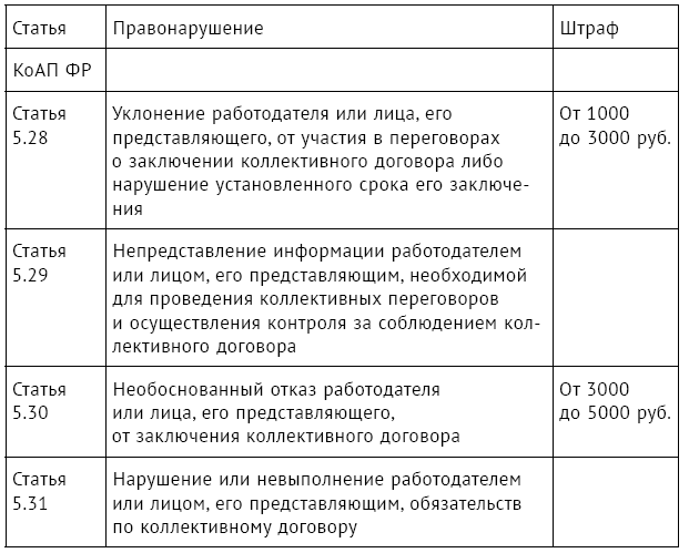 За уклонение от участия в коллективных переговорах, а также за нарушение или невыполнение условий коллективного договора законодательством предусмотрена административная ответственность. Виды правонарушений, допускаемых в ходе ведения коллективных переговоров, а также наказаний представлены в табл. 26.