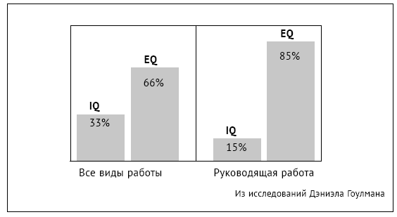 Другими словами, чем выше был ранг руководителя, тем больше навыков эмоционального интеллекта было заложено в фундамент его успеха. Хотя в каждой организации есть свои особенности, тем не менее везде навыки эмоционального интеллекта составляют подавляющее большинство важнейших отличительных черт лидера. При сопоставлении выдающихся представителей топ-менеджмента с середнячками, занимающими посты такого же уровня, оказалось, что около 85 % различий в их эффективности можно приписать факторам эмоционального интеллекта, а не специальным знаниям.