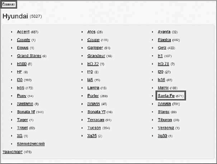 2. Страница, созданная под более конкретный запрос «Запчасти для Hyundai Santa Fe»: здесь размещен список подкатегорий и всех запчастей для автомобиля Hyundai модели Santa Fe.