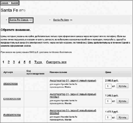 3. Страница, созданная под запрос «Запчасти на Hyundai Santa Fe Classic»: здесь вы видите все запчасти, которые подходят именно для данного автомобиля, и, разумеется, ссылки на эти запчасти.