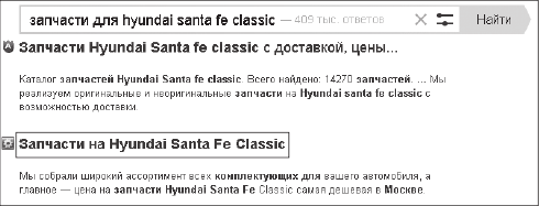 Как видите, пользователь ввел в строке поиска конкретный запрос «запчасти для hyundai santa fe classic». Поисковая система выдала ему ссылку на страницу, обозначенную в нашем вышестоящем списке под номером три, то есть на конкретную страницу, максимально отвечающую запросу (как видите, ссылка на эту страницу обведена на картинке красным).