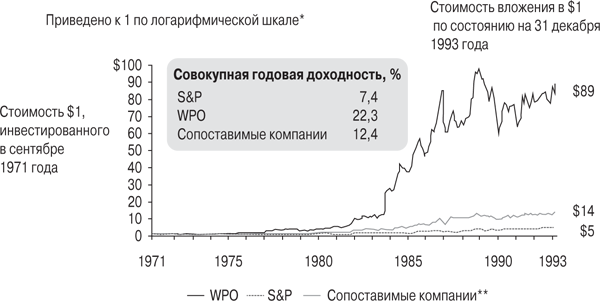 В меньшей степени говорилось о том, что сделала Грэм для акционеров. С момента IPO в 1971 году и до ухода Грэм в отставку в 1993-м совокупная годовая доходность для акционеров достигла невероятных 22,3 %, опередив индекс S&P (7,4 %) и конкурентов (12,4 %). Доллар, вложенный в компанию при первичном размещении ее акций (IPO), стоил 89 долларов к тому времени, когда Грэм ушла в отставку. Для сравнения, за тот же период в среднем по отрасли этот показатель составил бы 14 долларов, а в случае с S&P – 5 долларов. Как показано на рис. 5.1, Грэм обогнала индекс S&P в 18 раз, а конкурентов – более чем в шесть раз. Все 22 года руководства компанией она просто-напросто была лучшим управляющим в газетной индустрии страны, оставив всех далеко позади.