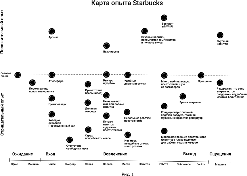 Органический подход – метод описания путешествия потребителя на основании того, как клиент реально взаимодействует с компанией на каждом этапе любого процесса. Это буквально физический маршрут отдельно взятого человека. Этот способ не универсален и применим главным образом для предприятий розничной торговли, ресторанов и отелей. В его основе лежит мысль, что потребительское путешествие строится с нуля для каждой компании. Чтобы построить путешествие в органической логике, нужно прежде всего понаблюдать за клиентом и «походить в его ботинках». Яркий пример органического подхода – Starbucks. Если взглянуть на карту путешествия потребителя Starbucks, видны этапы физического перемещения пользователя (рис. 1).