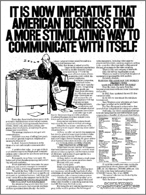 Сотрудники рекламного агентства, создавшего данную рекламу, должно быть, думали, что им в голову пришла весьма хитроумная идея. Она заключается в том, чтобы продемонстрировать разницу между стандартной скучной корпоративной коммуникацией и новым, более стимулирующим способом проведения видеопрезентаций (тогда, в середине 1970-х гг., эта новинка только появилась).