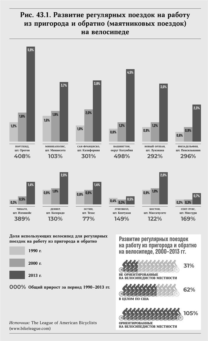 Результатом всего этого оказалось то, что велосипед стали использовать для поездок на работу более чем на 400 % чаще в таких городах, как Вашингтон, Портленд и Орегон. Даже в таком центре деловой жизни, как Сан-Франциско, число приезжающих на работу на велосипеде возросло более чем втрое. Наряду с местами для обычных автомашин и электромобилей в гаражах часто можно встретить велосипедные стойки. Во многих городских многоквартирных домах стали вновь появляться помещения для хранения велосипедов.