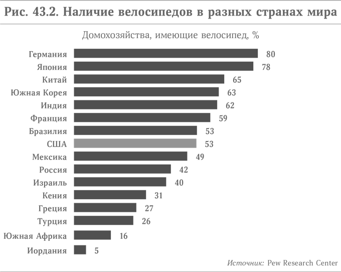 По большей части для развития велосипедного движения в США адаптируются программы, уже показавшие определенную эффективность в некоторых европейских странах. Например, в Германии велосипед используется в 80 % домохозяйств. В Японии таких домохозяйств 78 %, а в Таиланде – 74 %. Во многих густонаселенных городах Азии без велосипеда и правда не обойтись. Кроме того, обычным тайцам автомобили не по карману. В Соединенных Штатах велосипед есть только в 53 % домохозяйств. Любопытно, насколько различаются эти цифры по странам. Так, велосипед есть лишь в 5 % домохозяйств Иордании и у 7 % ливанских семей.