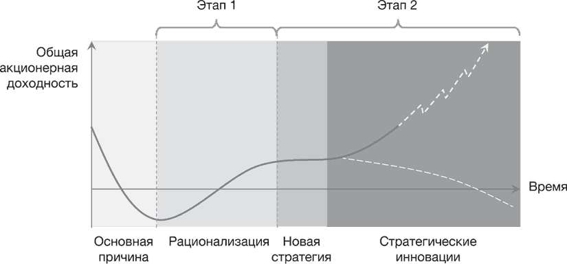 Некоторым фирмам удается предвидеть наступление агрессивных условий. Для этого они используют опережающие индикаторы: технологические сдвиги, появление конкурентов-аутсайдеров, новые способы и направления выгодных инвестиций, уровень неудовлетворенности или оттока клиентов либо снижающиеся темпы роста. Однако подобные случаи, когда стратегия восстановления реализуется на опережение, встречаются на удивление редко[193]. В данной главе мы рассмотрим только более распространенные ситуации, когда трансформация является ответной мерой.