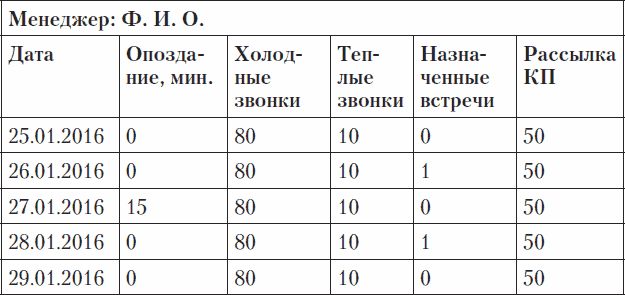 Чтобы отслеживать выполнение менеджерами плана активности, необходимо разрабатывать и внедрять систему отчетности. Она предполагает, что менеджеры по итогам дня заполняют отчетность, указывая в ней реальные, достигнутые за день показатели. Пример отчетности по плану активности приведен в табл. 6.2.