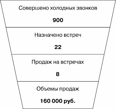 Систематизируя показатели плана активности за некий период и сравнивая их с показателями продаж за это же время, можно определить, какое количество и каких действий приближает к желательному результату. Это удобно делать, анализируя воронку продаж (рис. 6.2).