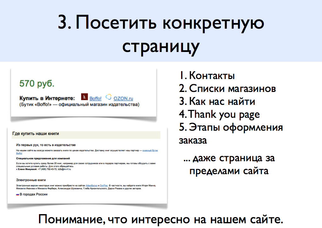 Эта страница для вас – целевая. Хотите привести человека с сайта в свой магазин в центре Москвы? Значит, целевой страницей будут «Контакты», «Время работы» и «Схема проезда».