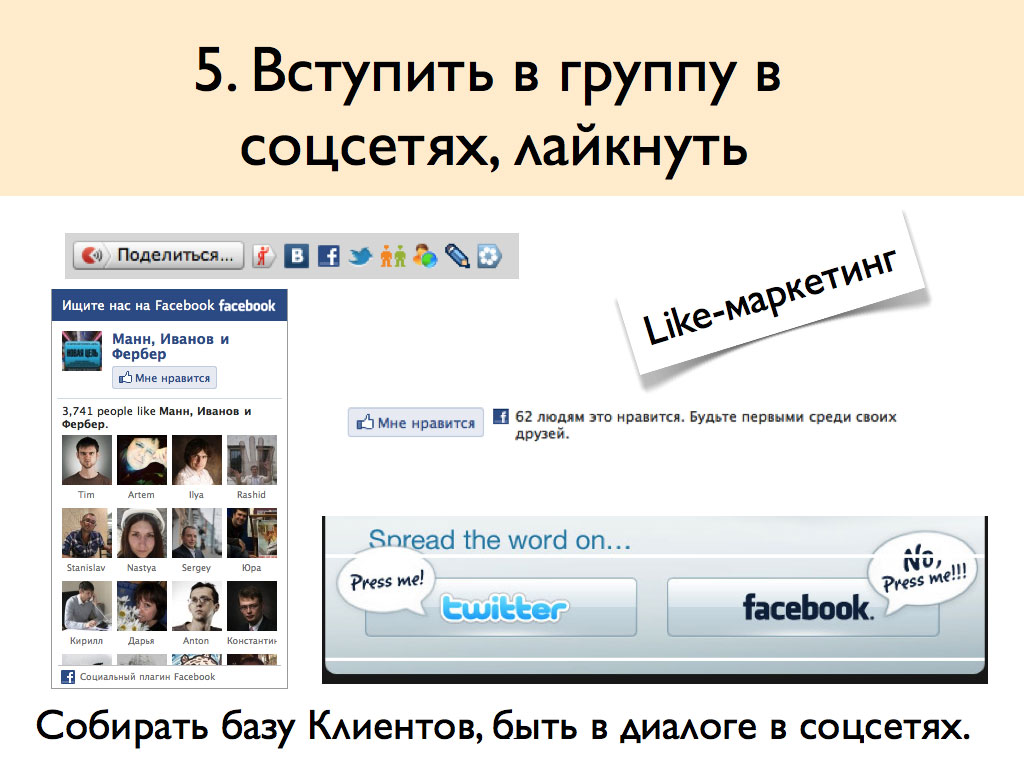 По статистике, люди больше доверяют информации, полученной от своих друзей, чем сведениям, предоставленным самой фирмой. Поэтому компании часто просят Клиента, купившего у них что-то в Интернете, рассказать об этом в соцсетях.