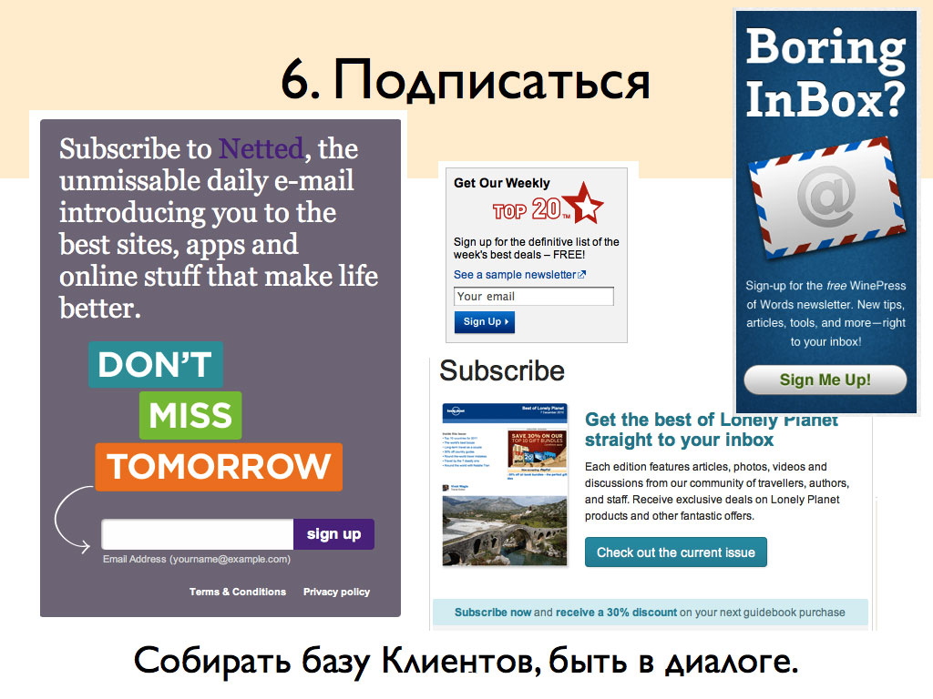 Для компаний, ориентированных на повторные продажи и выстраивание долгосрочных отношений с Клиентами, это важнейший инструмент. Ведь именно электронная почта остается эффективнейшим средством повторной коммуникации. Мы подробно поговорим о ней в главе про удержание. А здесь лишь напомним, что сбор базы подписчиков – важная задача. Если посетитель забыл про вас или не помнит адрес вашего сайта, ему всегда можно написать письмо.