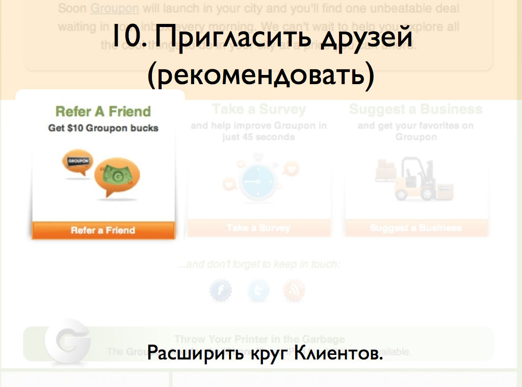 Вы можете мотивировать посетителей пригласить друга, переслать письмо и т. п. Вспомните программы Яндекс. Диск, Dropbox или приведенный на скриншоте Groupon. Они-то точно знают, что лучшая продажа – когда ваши Клиенты сами приводят вам новых Клиентов. Совмещая это целевое действие с другими (упоминание в социальных сетях, цитирование и/или заполнение формы), превращайте ваших Клиентов в ваших продавцов. Главное – не забыть поблагодарить Клиента.