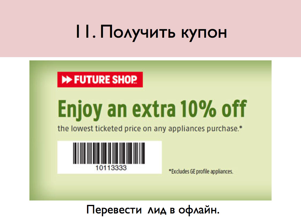 Эта цель прекрасно подойдет для компаний, у которых нельзя напрямую что-либо купить в Интернете, но в офлайне они ведут активную деятельность. Предлагая распечатать купон на скидку и предъявить его в ближайшем магазине, вы приведете людей от монитора прямо к себе на кассу и поднимете продажи!