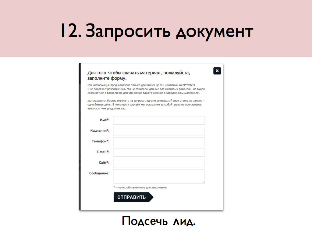 Дайте посетителю что-то нужное и полезное, попросив взамен информацию о нем. Если скачать файл – это теплое целевое действие, то отдать информацию взамен на получение другой информации – действие уже очень горячее.