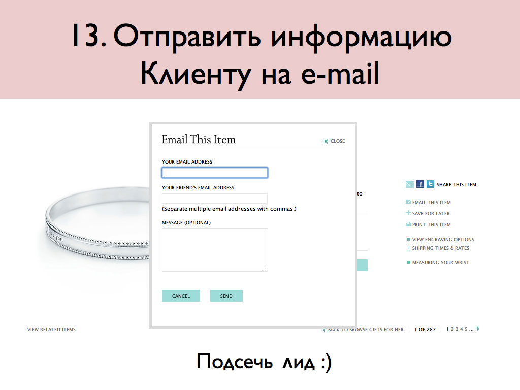 Отличная замена процедуре регистрации. Например, посетитель составляет список понравившихся ему товаров и сразу получает его на электронную почту. Сайт же получает координаты посетителя – его e-mail.