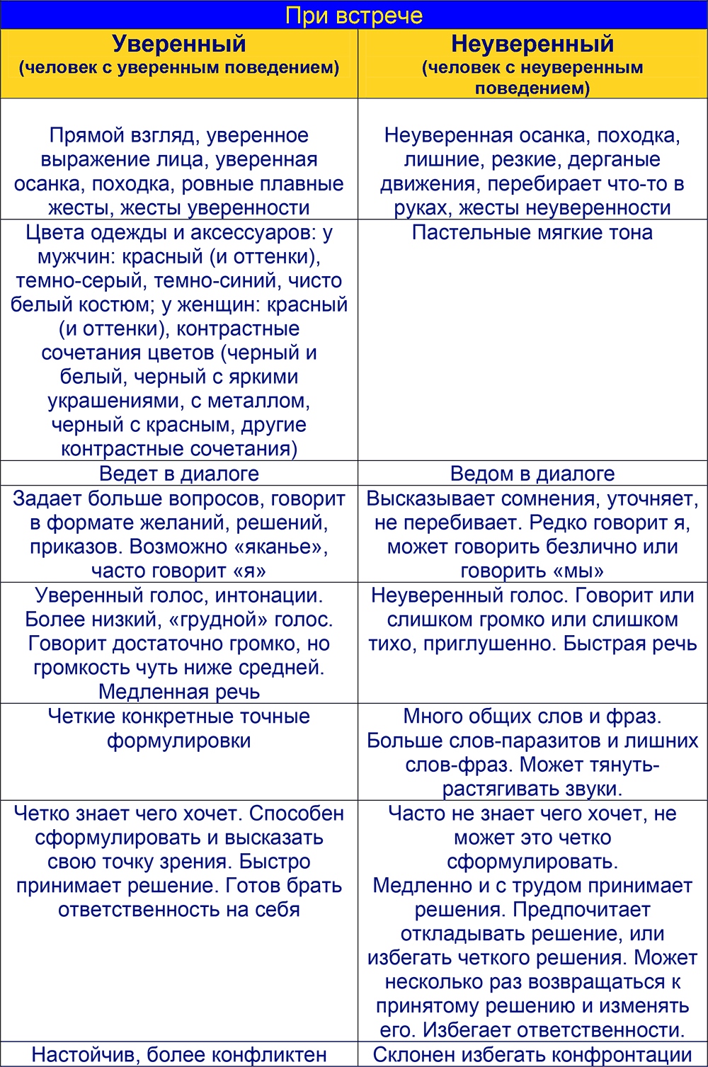 Вспомните 2–3 последних встречи. К каким типам (уверенный или неуверенный) Вы отнесете своих собеседников? По каким сигналам Вы это определили?