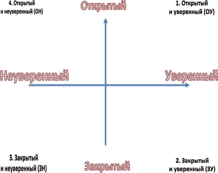 Напомню, что мы с Вами будем выделять 4 типа клиентов в зависимости от открытости-закрытости и уверенности-неуверенности поведения человека: