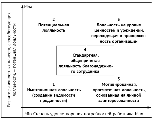 При средней степени мотивированности и среднем потенциале лояльности мы получаем общепринятую, стандартную лояльность обычного благонадежного сотрудника, которая и присутствует в большинстве своем во всех организациях. Действительно, найти очень преданных и верных сотрудников – сложная задача. Большинство компаний могут себе позволить такое только по отношению к избранным сотрудникам, чаще всего к руководству. При общепринятой стандартной лояльности мы получаем определенный баланс личностного потенциала и мотивационных возможностей компании, который и создает условия для нормального функционирования большинства организаций.
