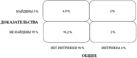 До сих пор все шло хорошо. Применив теорему Байеса, как в примере с такси и медицинским исследованием, мы получим цифры, представленные в табл. 9.1. Существуют две вероятности появления белья: одна – что партнер не завел интрижку (5 % от 96, или 4,8 %) и вторая – что он ее завел (50 % от четырех, 2 %). Вероятность интрижки с учетом таинственного белья рассчитывается следующим образом: 0,02 / (0,02+ + 0,048) = 294, или 29,4 %.