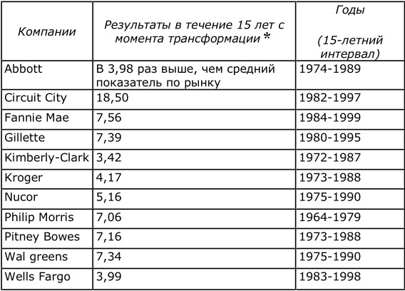 Нашей первой задачей было определить компании, чьи показатели позволили бы отнести их к разряду „великих“, как показано на графике 1.А. Для этого мы предприняли „смертельный“ шестимесячный поход в глубины финансового анализа, разыскивая компании, чьи показатели удовлетворяли бы следующим критериям: совокупная доходность по акциям на уровне или ниже среднего показателя по рынку в течение J 5 лет до момента преобразования; затем, совокупная доходность по акциям как минимум в три раза выше, чем средний показатель по рынку в течение 15 лет после преобразования. Мы выбрали временной интервал в 15 лет, потому что он исключает чистое везение (вам не может просто везти в течение 15 лет) или благоприятные периоды на рынке. Это также превышает средний срок пребывания на посту генеральных директоров компаний (таким образом, нам удалось отделить выдающиеся компании от компаний, которым просто случилось иметь выдающихся руководителей). Мы поставили условием трехкратное превышение среднего показателя по рынку, поскольку это выше, чем средний показатель компаний, которые было принято считать великими. Для сравнения, взаимный фонд, включающий „королевские“ акции компаний, которые приведены ниже, с 1985 до 2000 превзошел средний показатель по рынку только в 2,5 раза, в него вошли бы: ЗМ, Boeing, Coca-Cola, General Electric, Hewlett-Packard, Intel, Johnson & Johnson, Merck, Motorola, Pepsi, Procter & Gamble, Wall-Mart и Walt Disney. Неплохой соперник, чтобы помериться силами.