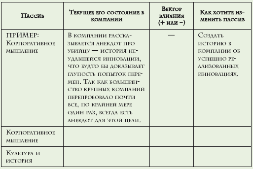 Посмотрите на представленный список пассивов компании и запишите, как сейчас они работают в компании, отметьте, какое влияние они оказывают на деятельность компании (положительное или отрицательное) и как хотелось бы их изменить.