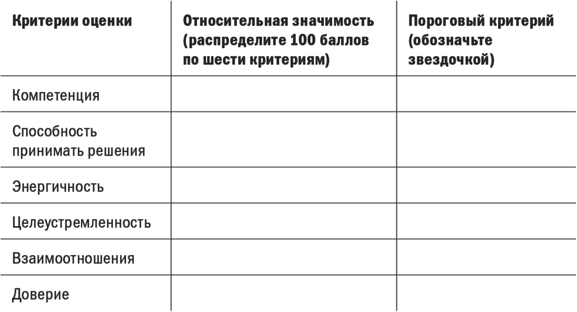 Чтобы быстро интерпретировать критерии, которые вы используете, заполните табл. 7.1. Распределите 100 баллов по шести критериям в зависимости от их важности при оценке ваших подчиненных. Запишите цифры в средней колонке, убедитесь, что в сумме они составляют 100. Затем выделите один из этих критериев в качестве «порогового», то есть если сотрудник не соответствует именно ему, все остальное уже не имеет значения. Пометьте этот критерий звездочкой в правой колонке.