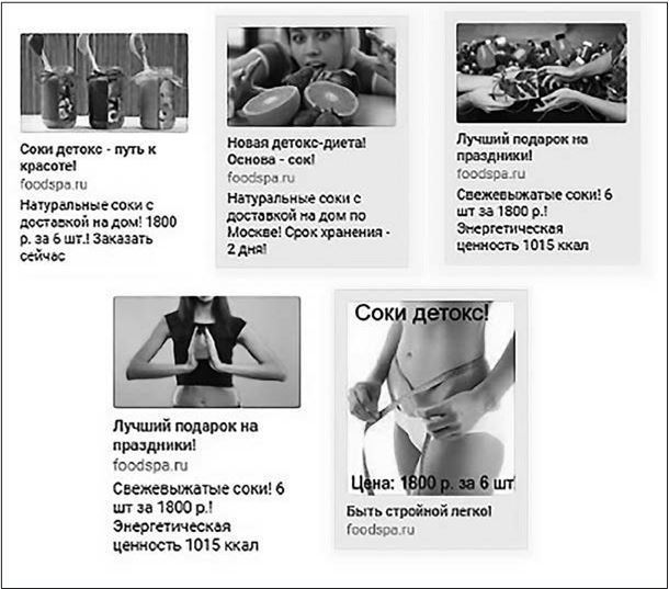 Продукт — детокс-программа на основе соков холодного отжима. Целевая аудитория — женщины, домохозяйки в возрасте от 25 лет, собранные с помощью парсера из групп для мамочек (дети родились год назад, надо похудеть). Время запуска — самое начало января. А вопрос такой: хорошие это тизеры или нет (рис. 3.13)?