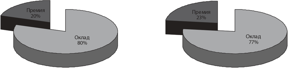 Рис. 11.11. а) Структура суммарной оплаты, если бонус составляет 25 % от оклада; б) структура суммарной оплаты, если бонус составляет 30 % от оклада