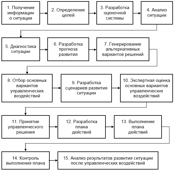 Этап 15. Анализ результатов развития ситуации после управленческих воздействий. Завершает процесс принятия управленческого решения анализ результатов реализации принятого управленческого решения, который учитывается при принятии последующих управленческих решений. Реализованный план или его фрагмент должны быть подвергнуты тщательному анализу с целью оценки эффективности принятых управленческих решений и хода их реализации.