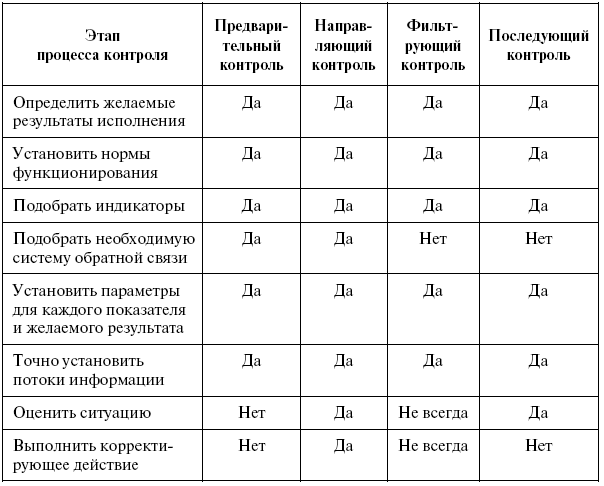 В табл. 4.1 приведены основные технологические этапы управленческого контроля и указана необходимость их выполнения в случае использования того или иного метода контроля.