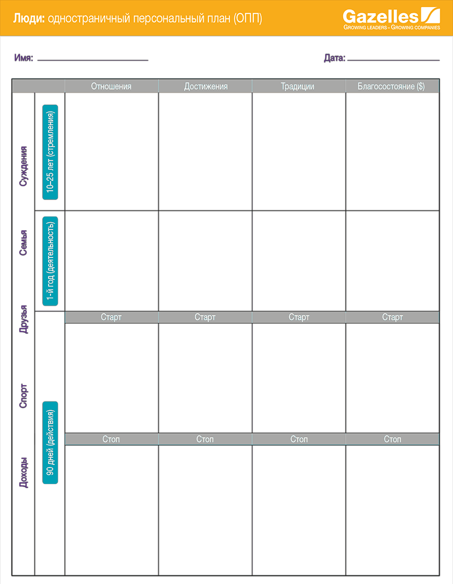 Одностраничный персональный план (ОПП). Ваша личная жизнь и профессиональная тесно переплетены, и лучше всего, если они будут сбалансированы. Этот инструмент помогает распределить усилия по четырем областям – отношения, достижения, традиции и благосостояние, – которые соотносятся с четырьмя сферами вашей деятельности в бизнесе (люди, стратегия, исполнение и деньги). Стабильная и наполненная личная жизнь создает прочное основание для успеха в бизнесе.