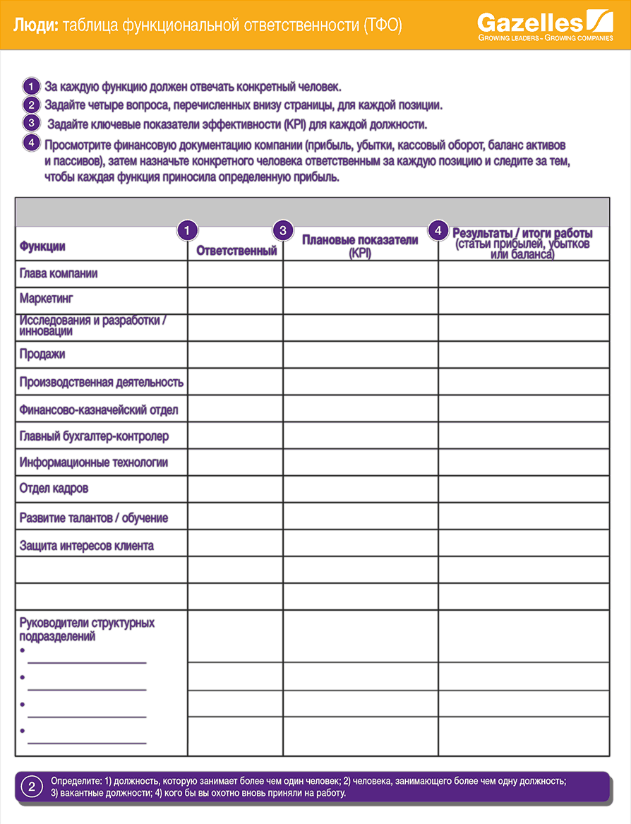Таблица функциональной ответственности (ТФО). Джим Коллинз, автор книги «От хорошего к великому»[6], подчеркивает, как важно усадить на подходящие места в вашей организации подходящих людей. В конце концов самое узкое место – горлышко бутылки! Таблица функциональной ответственности содержит список мест (должностей), которые должны быть в любой организации.