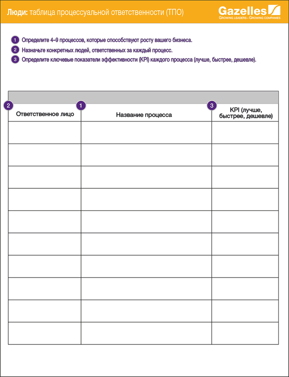 С помощью этой таблицы вы сможете подробно расписать от четырех до девяти основных процессов в вашем бизнесе (например, разработка и запуск новой продукции; привлечение и наем новых сотрудников; выставление счетов и получение платежей и т. д.).