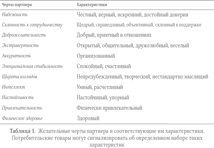 Естественные особенности (например, черты лица) и поведение (правила этикета за столом) дают нам широкий спектр сигналов. Но и у тех, и у других есть свои серьезные ограничения. Мы уже отмечали, что, хотя лица и подают довольно явные социальные сигналы, их черты не слишком-то склонны меняться (хотя целые индустрии – от косметики до пластической хирургии – и работают над этим). А вот поведение обладает значительной гибкостью, но на наблюдение и оценку многих типов поведения уходит довольно много времени. В некоторых случаях – возьмем, к примеру, ухаживание – люди тратят месяцы и даже годы на наблюдение за романтическим партнером и его оценку, прежде чем убедятся в том, что сделали правильный выбор. Способность использовать товары для демонстрации своей ценности как социальных партнеров стала замечательным новшеством, которое, скорее всего, и сделало возможным возникновение сложных обществ. Как и лица, сигнальные товары (от одежды до мотоциклов) видимы для окружающих и могут быть быстро ими оценены. Кроме того, они рекламируют своего носителя большой группе людей одновременно. Однако в отличие от лиц товары обладают многочисленными сигнальными возможностями и в этом смысле подобны поведению. Действительно, товары и поведение часто согласованы друг с другом, и по вещам можно предсказать, как будет вести себя их обладатель. Чтобы дать вам представление о разнообразии посылаемых нами сигналов, мы собрали в таблицу черты, которые люди считают наиболее важными в других (табл. 1){139}. Мы используем товары для передачи сигналов о любой из этих черт – от очков в толстой оправе, чтобы казаться умнее, до забавных эксцентричных аксессуаров.