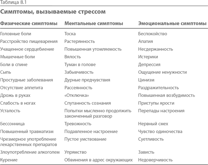 Чтобы не «захлебнуться» адреналином, необходимо осознать, что вы идете неправильным путем. В идеале это нужно сделать задолго до того, как прозвенит «первый звонок», то есть разовьется опасная болезнь, начнутся приступы тревоги по ночам, испортятся отношения с людьми, разорится компания. Первые и самые очевидные последствия стресса обычно проявляются на уровне психики, но они могут быть и эмоциональными, и ментальными, и духовными. Внимательно следите за симптомами, представленными в таблице 8.1. Они свидетельствуют о том, у вас уже возникли или вот-вот возникнут проблемы со здоровьем. Если вы заметили их, следует обратиться к знающему и внимательному врачу, который не только назначит лечение, но и научит использовать приемы самопомощи.