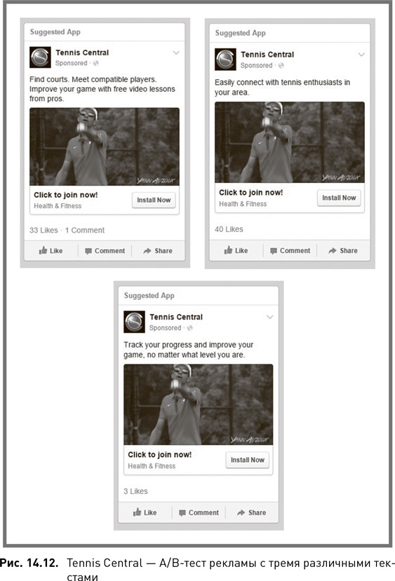 Мы решили погрузиться еще глубже. Текст публикации, который мы использовали, был в каком-то смысле всеобъемлющим. Он описывал все аспекты приложения – от технических до социальных. Но что будет, если мы разделим эти идеи и создадим одну публикацию, посвященную межличностным связям, а вторую – теме улучшения навыков игры (рис. 14.12)? Как выяснилось, аудитории понравился более простой текст со словами «Быстрый контакт с любителями тенниса в вашем районе». Более того, мы смогли лучше понять, что представляет собой аудитория Tennis Central в целом. Возможность связываться с людьми была для нее одним из основных факторов, способствующих загрузке приложения. Эта фраза отлично подошла и для наших офлайновых маркетинговых материалов.