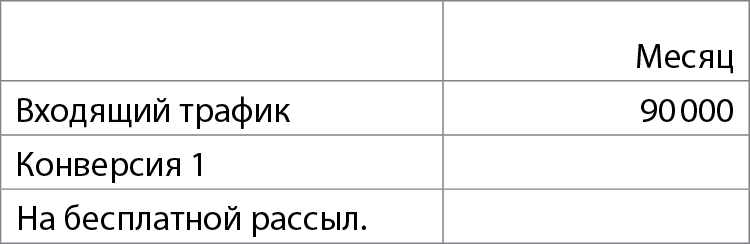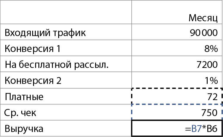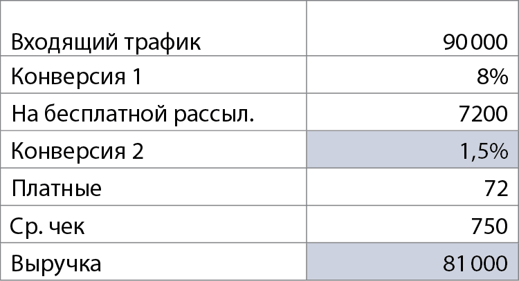 3. Прописываем вторую конверсию — 1 %. Это значит, что из читателей бесплатной рассылки 1 % подпишется на платную. Число подписчиков на платный курс умножаем на средний чек и видим примерную выручку.