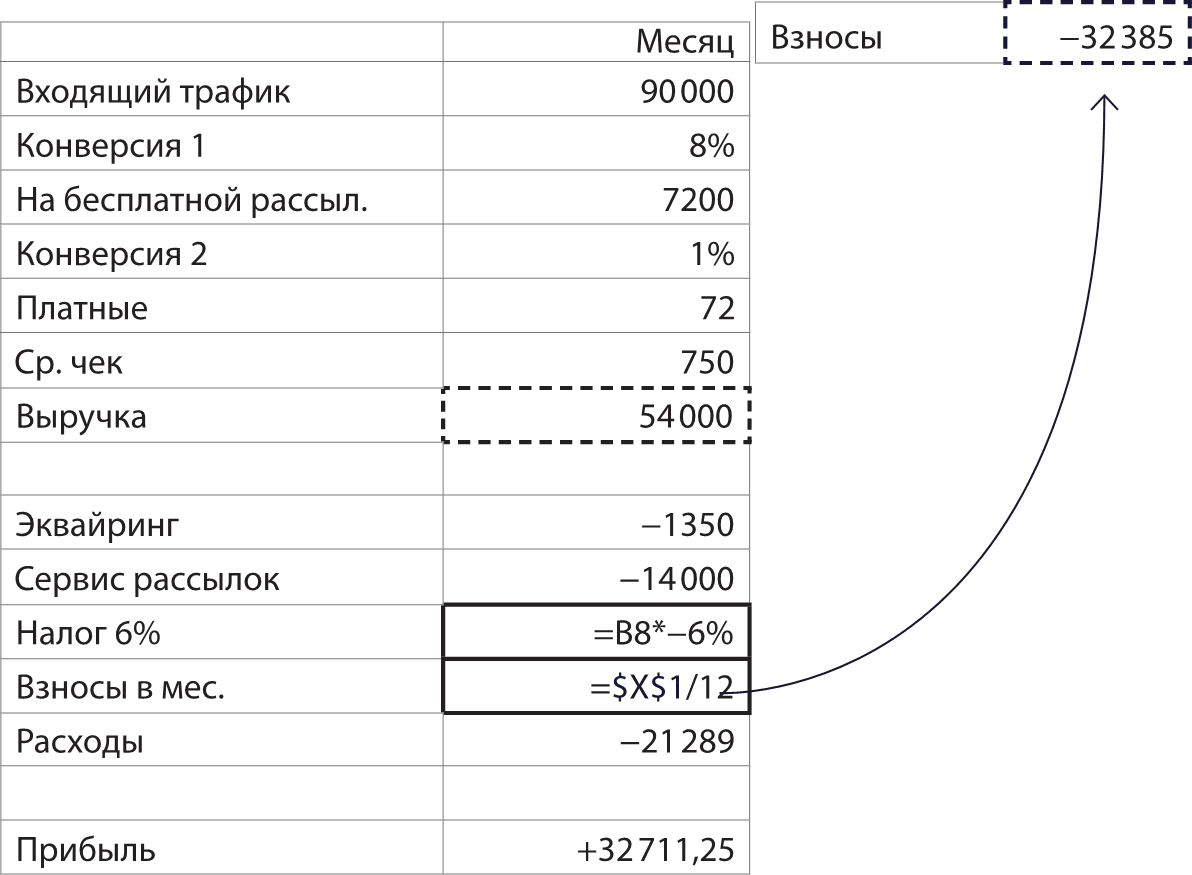 Налоги посчитаем как выручку, умноженную на ?6 % (так как это расход, нам нужно отрицательное число). Еще есть нефиксированные взносы сверх порога в 300 000 рублей в год, но мы их в этот расчет включать не будем для простоты. Ну и они вряд ли как-то фундаментально повлияют на наш расчет — нужно помнить, что всё это примерные расчеты, а не прогноз до копейки.