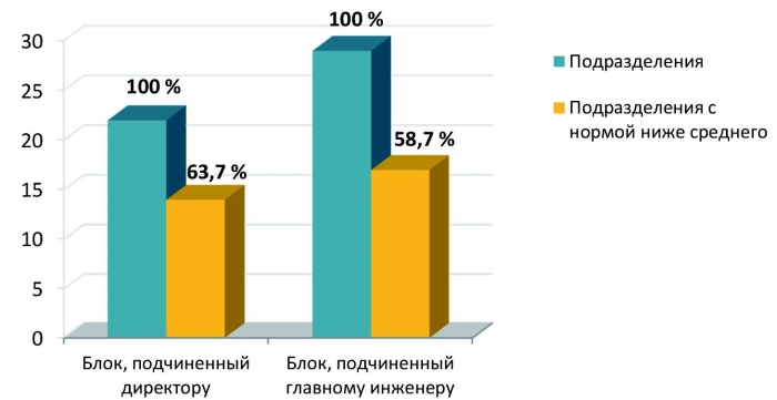 При этом в блоке подразделений, подчиненных директору (сервисные непроизводственные подразделения), ниже среднего имеют нормы 14 подразделений из 22 (63.7 %).