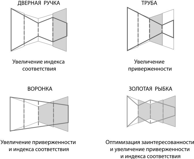 С другой стороны, бренды, использующие модель воронки, должны улучшить и уровень приверженности, и уровень индекса соответствия. Это демонстрирует значимую проблему, с которой сталкиваются товары длительного пользования и сервисные бренды для обеспечения баланса между продажами и послепродажным сервисом. Но самую нелегкую работу придется выполнить тем брендам, которые на клиентском пути используют модель золотой рыбки. Им необходимо не только улучшить уровни приверженности и индекса соответствия, но и оптимизировать уровень заинтересованности. Маркетологи в B2B-секторах сталкиваются с этой сложной задачей, поскольку обычно имеют дело с подкованными клиентами (см. рис. 7.3).