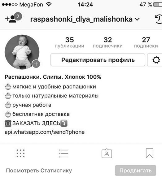 Это лайфхак, который добавит миллион баллов к лояльности ваших клиентов. Тем, кто работает и покупает в «Инстаграме» до тошноты знакома цепочка: увидеть интересный товар, который нужно заказывать через «Вотсап», переписать номер, указанный в шапке профиля, сохранить его к себе в телефонную книгу, зайти в «Вотсап», написать сообщение. Мне лично всегда лень это делать, да и жалко времени! Забудьте этот кошмар — можно же разместить прямую ссылку на диалог в WhatsApp!