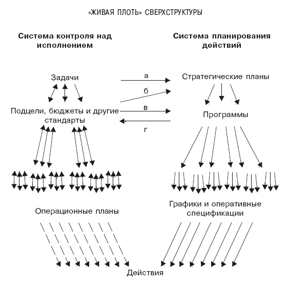 Система планирования действий имеет преимущественно нисходящий характер. Теоретически, она начинается со стратегического планирования: организация систематически оценивает свои сильные и слабые стороны с учетом тенденций внешней среды, а затем формулирует четкий комплексный набор стратегий, которые будут реализованы в будущем. Далее стратегии перерабатываются в «программы», то есть конкретные проекты, – например, создание новой товарной линии, строительство новой фабрики, реорганизация структуры. Программы, в свою очередь, детализируются, составляются графики их выполнения, и, наконец, они оформляются в виде конкретных оперативных инструкций (заданий) – позвонить клиенту, залить цемент, напечатать органиграмму, – которые материализуются в конкретных действиях.