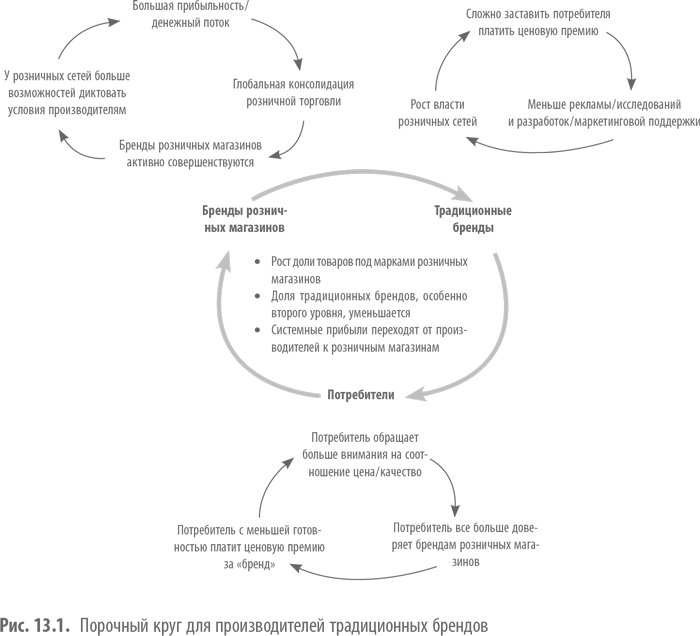 Вопреки мнению многих, не надо ждать, что процессы роста доли товаров под марками торговых сетей в разных отраслях – начиная от фасованных потребительских товаров и одежды и заканчивая оформлением интерьера, офисными принадлежностями и инструментами для самостоятельного ремонта – будут напоминать движение маятника. Начиная с 1999 г. в опросах, проводимых американским торговым журналом Progressive Grocer, топ-менеджеры супермаркетов помещали пункт «Придавать особое значение товарам под марками торговых сетей» первым в списке из 26 возможных приоритетов, т. е. для них это было самым важным. На рис. 13.1 показано, что производители традиционных брендов оказываются в замкнутом круге.