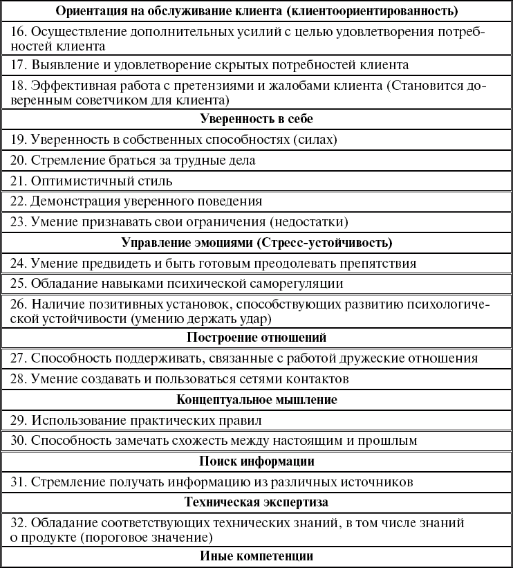 Например, С. М. Спенсер и Л. М. Спенсер в книге «Компетенция в работе: модели высокой производительности» обобщили опыт 286 исследований, проведенных в разных типах организаций и на этой основе составили словарь из 21 компетенции, выделенной в кластеры. Обычно каждый кластер содержит от двух до пяти компетенций, описание кластеров сходны с описанными в словаре. Каждая компетенция имеет повествовательное определение и от трех до шести поведенческих индикаторов. Выделили 360 индикаторов, по которым были проиндексированы все модели компетенций. Поведенческие индикаторы компетенций обладают свойствами шкалы: очевидная прогрессия от низшего уровня к высшему в одном или более измерениях.