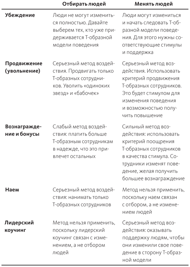 Существуют два фундаментальных способа «вырастить» команду Т-образных менеджеров — отбор и изменение (табл. 5.1). Некоторые лидеры полагают, что люди не могут измениться полностью.