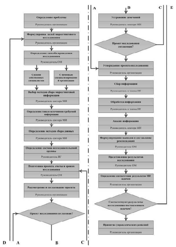 Графическое представление процессов маркетингового исследования в виде блок-схемы обеспечивает их транспарентность для всех исполнителей, что значительно облегчает задачу по анализу, оптимизации (совершенствованию) и практическому использованию таких процессов в рамках МИС.