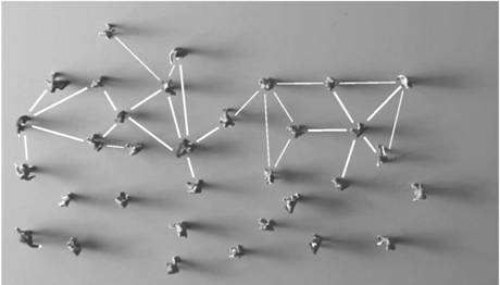 У одних точек в нашей модели (ранние поселенцы и «творцы» — «обитатели края») больше связей, чем у других, а многие из этих типов связей образовывали группы. Для примера вспомним сеть в Восточном Лондоне: творцы сосредоточивались на одной и той же улице, на одном складе или образовывали группу, которая регулярно встречалась в одном и том же баре или клубе.