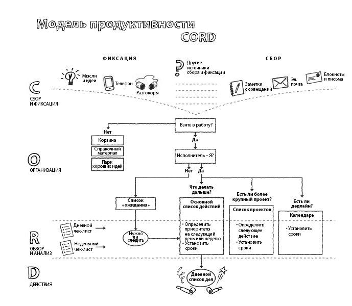 Дабы ваш мозг мог полностью расслабиться и передать контроль системам второго мозга, следует педантично пройти все этапы модели CORD. У каждого человека в рамках его должности это происходит по-своему. Если вы, к примеру, секретарь, то чаще имеете дело с информационными потоками, нежели с проектами. Ваша работа заключается в сборе и фиксации информации, ее организации и принятии решений прямо на месте. Если же вы – глава корпорации, то, конечно, тоже получаете электронные письма и звонки, но основная ваша работа заключается в руководстве и управлении: вы должны следить за тем, что происходит «на передовой», где ваши работники занимаются реальной работой, и направлять их действия. Таким образом, вы будете делать акцент на разных частях модели CORD. Но, кем бы вы ни были, вы должны выработать в себе эти четыре важных навыка и объединить их в единую цельную систему, поэтому, когда мы будем их обсуждать, не говорите себе: «Ко мне это не относится». Это относится ко всем. Единственное различие – степень акцентирования каждого навыка.
