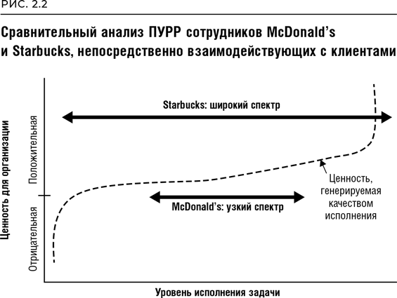 В Starbucks дело обстоит иначе. Здесь от сотрудников, непосредственно общающихся с посетителями, требуются способности в самых разных областях. Имидж этой кофейни как «третьего места»[17] для работы и отдыха определяется, в частности, возможностью приятного общения с местными бариста. Некоторые из них – оперные певцы, поющие содержание заказов. У каждого из них имеется собственный образ, который обслуживающий персонал открыто демонстрирует клиентам: среди них есть и готы, и поклонники стиля кантри, и хипстеры. Starbucks позиционирует разнообразие как часть своего имиджа[18]. Поэтому бариста здесь могут свободно петь, шутить и давать гостям непрошеные советы. Уровень ПУРР для сотрудников Starbucks гораздо шире, он включает и плавно растущую, и даже быстро растущую ценность. Качество работы тут напрямую сказывается на прибыли заведения, однако при этом и риск совершить ошибку гораздо выше. Ошибки – это та цена, которую Starbucks платит в погоне за быстро растущей ценностью (рис. 2.2).